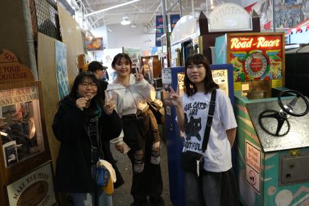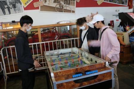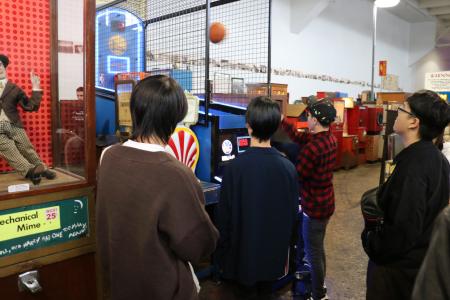 1900年代初頭のコイン式アーケードゲームや自動演奏機械が並ぶ館内で、学生たちは実際にプレイを楽しみながら、アナログ技術の魅力やゲームの原点に触れました。
