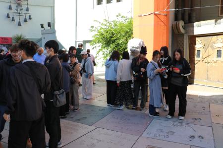 映画俳優の手形・足形が並ぶチャイニーズ・シアター前では、多くの学生が映画の世界観に浸りながら写真撮影を楽しみました📸