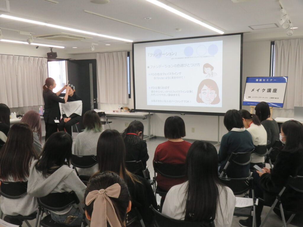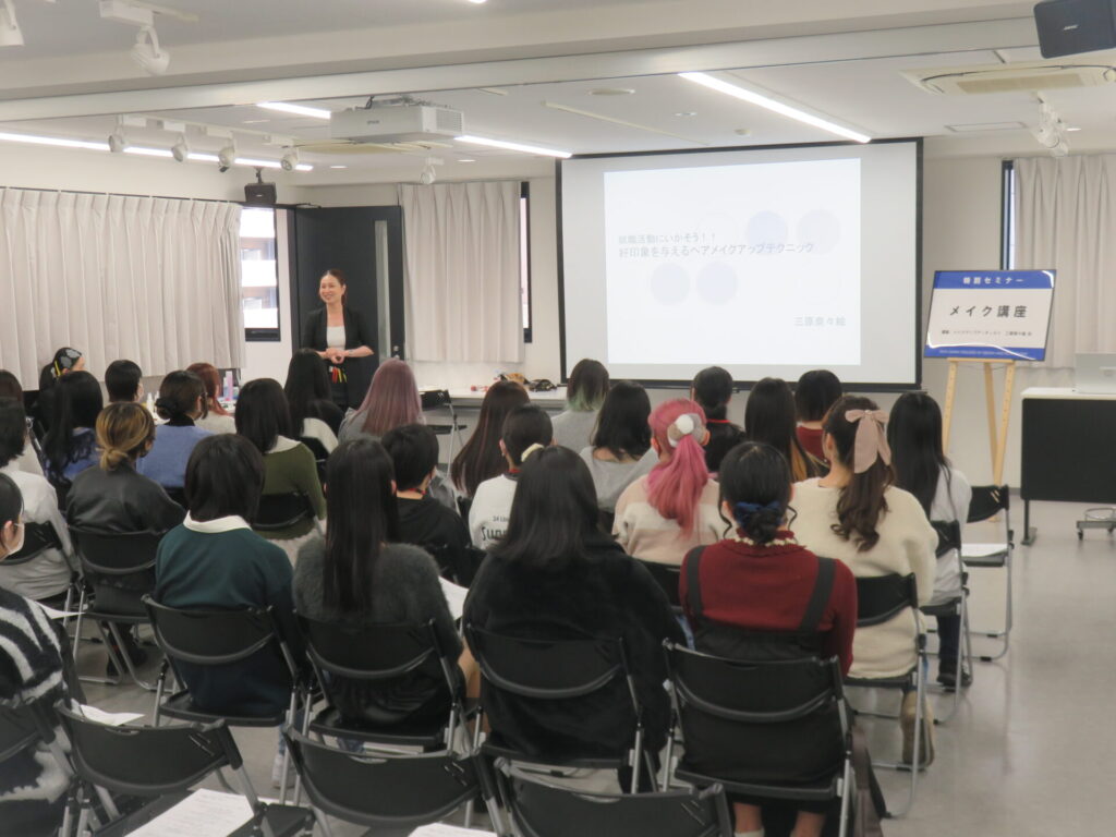 参加した学生は講師の先生のご指導の下、普段とは違う、就職活動に向けたメイク方法を学んだ講座となり、充実したものとなりました。
